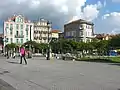 Ao sul da praça está a igreja da Virgem Peregrina, ao fundo. A Casa das Caras está localizada na praça da Estrela.