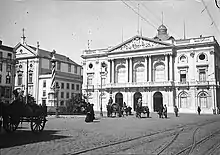 Vista do Tribunal da Relação de Lisboa, em inícios do século XX; oposto ao pelourinho, a norte dos Paços do Concelho, a Igreja de São Julião (Banco de Portugal).