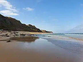 Extensa e envolvida por imponentes falésias, é popular entre os pescadores à linha, que ali procuram sargos, douradas e robalos. No Verão, os banhistas concentram-se na zona mais perto do café. Trilhos estreitos permitem o acesso a várias zonas da praia a partir de morros circundantes.[2]