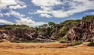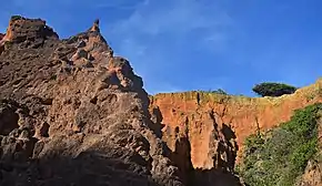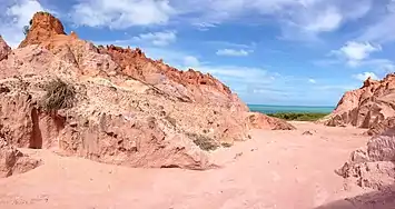 A praia é bem servida de vários canyos, que são formações de ravinas, nas diversas falésias coloridas; esculpidas naturalmente com formas espetaculares. Causadas pela erosão da chuva e pelo aquecimento global; por onde as raízes das plantas enfraquecidas não conseguem mais reter o solo, que desaba com as chuva[1].