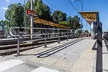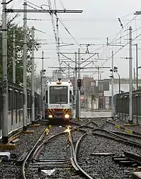 Um eléctrico no fim do ramal de pista única, para o Centro Cívico.