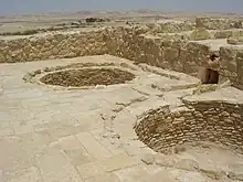 Antiga prensa de vinho em Israel, com a área de prensagem no centro e a cuba de coleta no canto inferior esquerdo