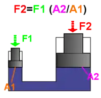 Assim o peso possível de ser levantado no ponto 2 é proporcional à área do êmbolo em 2, mesmo que pequenas forças e áreas existam em 1.