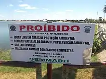 - Lei de Crimes Ambientais – A lei nº 9.605, sancionada em fevereiro de 1999 e regulamentada em setembro de 2000, estabelece as penas para as infrações e agressões cometidas contra o meio ambiente no Brasil. Prevê multas que chegam a 50 milhões de reais para uma variedade de infrações: pesca em locais proibidos, crimes contra o patrimônio, soltura de balões, pichações, caça ilegal, obras poluidoras, queimadas e desmatamento.