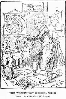 Roosevelt era adepto de cunhar frases inteligentes para resumir concisamente suas políticas. "Big stick" era sua frase de efeito para sua política externa de forte pressão: "Fale baixinho e carregue um grande bastão; você irá longe."[66] Roosevelt descreveu seu estilo como "o exercício de premeditação inteligente e de ação decisiva suficientemente antes de qualquer crise provável".[67] Conforme praticada por Roosevelt, a diplomacia do big stick tinha cinco componentes. Primeiro era essencial possuir sérias capacidades militares que obrigassem o adversário a ficar atento. Na época, isso significava uma marinha de classe mundial. Roosevelt nunca teve um grande exército à sua disposição. As outras qualidades eram agir com justiça em relação a outras nações, nunca blefar, atacar apenas se estivesse preparado para atacar com força e a disposição de permitir que o adversário salvasse a face na derrota.[68]