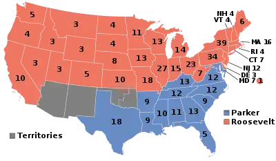 A questão da tarifa permaneceu adormecida durante o primeiro mandato de Roosevelt,[48] mas continuou a ser um importante tópico de campanha para ambos os partidos.[49] Os defensores da redução tarifária pediram a Roosevelt que convocasse uma sessão especial do Congresso para tratar da questão no início de 1905, mas Roosevelt estava apenas disposto a emitir um endosso cauteloso de um corte nas tarifas, e nenhuma outra ação foi tomada sobre a tarifa. durante o mandato de Roosevelt.[50]