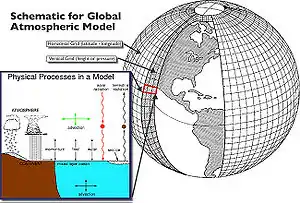 - O conjunto de equações, as quais constituem a "maquinaria" que executa a previsão e que é implementada sob a forma de programas informáticos executados numa plataforma adequada. Estas equações representam relações entre grandezas físicas relevantes; a título de exemplo, a equação do equilíbrio hidrostático descreve de forma aproximada a variação decrescente da pressão atmosférica com a altitude, e a equação do vento geostrófico descreve de forma aproximada o fluxo horizontal da atmosfera em torno de um centro de pressão a muito larga escala (escala sinótica). Dependendo do grau de sofisticação pretendido para a previsão, ou das grandezas que se pretende obter, as equações permitem prever a evolução do estado do ar em cada ponto de uma malha (tipicamente com dimensões regulares) a partir do estado actual nesse ponto e na sua vizinhança imediata. Podem ser exploradas várias técnicas matemáticas que permitam agilizar a velocidade e fiabilidade nos cálculos para a evolução entre cada instante sucessivo, levando em linha de conta as capacidades de computação disponíveis para a realização dos cálculos.