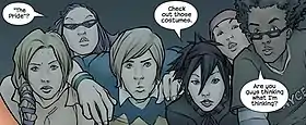 ![]() Capa de Runaways: Pride & Joy (2004), edição coletada em trade paperback. Apresentando: (atrás) Gertrude, Nico, Alex, Karolina, (frente) Chase e Molly. Arte de Takeshi Miyazawa. | |