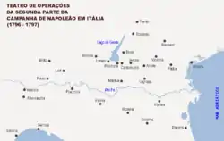 À custa da riqueza do Piemonte, Napoleão pagou às suas tropas, reequipou-as e preparou-se para continuar a ofensiva a fim de conquistar o segundo objectivo: a Lombardia, ou seja, expulsar os Austríacos de Itália.[24] Iniciou então o seu movimento para Nordeste. Beaulieu tinha disposto as suas tropas numa frente de quase 100 Km de extensão que, na margem norte do rio Pó, cobria todos os possíveis locais em que era possível atravessar aquele rio. Napoleão chego no dia 6 de maio a Castel San Giovanni e, no dia seguinte iniciou a travessia do rio Pó em Piacenza.[nota 5][25]