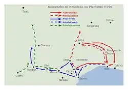 Do seu quartel-general em Carcare, Napoleão enviou ordens com vista a um ataque sobre o campo entrincheirado de Colli, em Ceva. Napoleão mudou o seu quartel-general para Millesimo e, no dia 18, as suas tropas avançaram. Ao atingirem as posições defensivas de Ceva, encontraram-nas vazias. Durante a noite, Colli tinha retirado para uma posição forte perto de Mondovì. Os Franceses lançaram um ataque frontal no dia 19, sem sucesso. No dia 21, Napoleão iniciou novo ataque com o envolvimento do flanco direito de Colli a ser executado por Surrier. A Batalha de Mondovi foi mais uma vitória das forças francesas e o Rei Victor-Amadeu III, reconhecendo a incapacidade de se opor aos Franceses assinou o Armistício de Cherasco a 28 de abril de 1796. Napoleão podia agora voltar-se contra os Austríacos.[23]