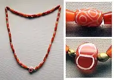 - Nota do Museu Britânico: "Contas de ouro e cornalina. As duas contas gravadas com padrões em branco foram provavelmente importadas do Vale do Indo. Elas foram feitas por uma técnica desenvolvida pela civilização harapeana."