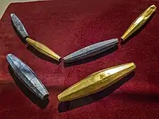 Uma adaga de ouro e uma adaga com cabo banhado a ouro durante às escavações de Ur em 1900.