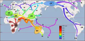 A chamada "dispersão recente" dos humanos modernos ocorreu há cerca de 70 a 50 mil anos.[64][65][66] É essa onda de migração que levou à disseminação duradoura dos humanos modernos em todo o mundo.