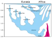 Um milhão de anos depois de sua dispersão, o Homo erectus estava dando origem a novas espécies. Os erectus são uma cronoespécie e nunca foram extinto, então sua "sobrevivência tardia" é uma questão de convenção taxonômica. Acredita-se que formas tardias de H. erectus tenham sobrevivido até cerca de 500 a 143 mil anos, no máximo,[note 1] com formas derivadas classificadas como H. antecessor na Europa há cerca de 800 mil anos e H. heidelbergensis na África há cerca de 600 mil anos. O H. heidelbergensis, por sua vez, se espalhou pela África Oriental (H. rhodesiensis), originando os humanos, e para a Eurásia, onde deu origem aos neandertais e denisovanos.