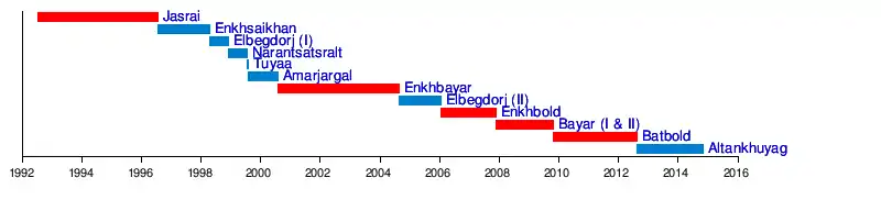 | Durante esse intervalo, Dendeviin Terbishdagva foi o primeiro-ministro em exercício | |||||