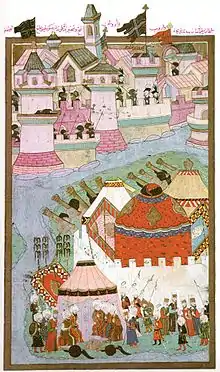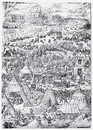 ![]() Gravura de confrontos entre os austríacos e otomanos fora de Viena, 1529 | |||