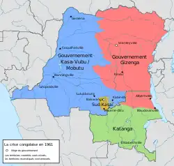 Lumumba, fugindo para Stanleyville, foi preso no início de dezembro por Mobutu e entregue a Moïse Tshombe que o assassinou em 17 de janeiro de 1961.[4][1] Um governo pró-Lumumba rival foi formado nesse meio tempo no leste do país, liderado por Pierre Mulele e Antoine Gizenga e apoiados pela URSS. Com a ajuda de forças da ONU e antigos oficiais brancos, Mobutu conseguiu recapturar todo o território nos anos seguintes. Mulele é morto e Gizanga preso enquanto Moïse Tshombe é exilado. Novas eleições finalmente ocorrerão no país apenas em 1965, após o estabelecimento da constituição da primeira república, conhecida como Constituição de Luluabourg, adotada por referendo em 10 de julho de 1964.