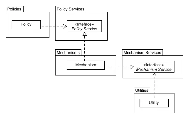 Um direto de pacotes de implementação da política de classes com serviço de resumos de aulas em uma biblioteca. Neste implementação de alto nível de componentes e componentes de baixo nível são distribuídos em pacotes separados, bibliotecas, onde as interfaces definem o comportamento/serviços exigidos pelo alto nível de componente são de propriedade, e existem dentro o alto nível do componente de biblioteca. A implementação de alto nível da componente de interface com o baixo nível de componente requer que o baixo nível de pacote de componente dependem do alto nível de componente para a compilação, portanto, a inversão convencional de relação de dependência.