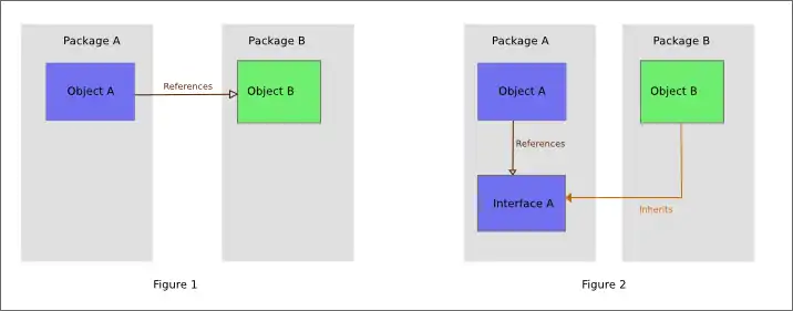 Figuras 1 e 2 ilustram o código com a mesma funcionalidade, no entanto, na Figura 2, uma interface tem sido utilizada para inverter a dependência. A direção de dependência pode ser escolhido de forma a maximizar a política de reutilização de código, e eliminar dependências cíclicas.