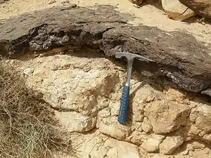 Uma secção estratigráfica Jurássica em rochas expostas na Makhtesh Gadol, de Israel. A rocha da base é mais antiga do que aquela sobrejacente, pelo princípio da superposição.