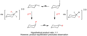 Ernest L. Eliel propôs que a reação hipotética de iodeto de ciclo-hexil com iodeto radiomarcado resultaria em um estado de transição completamente simétrico.[12] Como os conformes substituídos equatorial e axial reagiriam através do mesmo estado de transição, ΔΔG ‡ seria igual a zero. Pelo princípio de Curtin-Hammett, a distribuição dos produtos deve então ser substituída na posição axial em 50% e substituída na posição equatorial em 50%. No entanto, o equilíbrio dos produtos impede a observação desse fenômeno.