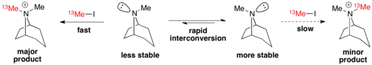 A alquilação de tropanos com iodeto de metila é um exemplo clássico de um cenário de Curtin-Hammett, no qual um produto importante pode surgir de uma conformação menos estável. Aqui, o conformador menos estável reage através de um estado de transição mais estável para formar o principal produto.[11] Portanto, a distribuição conformacional do estado fundamental não reflete a distribuição do produto.