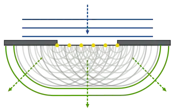 Em 1678[1], Christiaan Huygens propôs que cada ponto de uma frente de onda possui a funcionalidade de uma nova fonte pontual. Ou seja, a cada instante de tempo, a própria frente de onda gera infinitesimais novas ondas, a partir de cada um de seus pontos, dando origem a uma nova frente de onda no instante seguinte. Ele também supôs que apenas as propagações que seguem a direção inicial da onda têm energia suficiente para gerar uma onda secundária. Isso impede, por exemplo, que a luz se propague para trás iluminando locais escondidos por objetos. Caso contrário, não haveria sombra. Huygens foi capaz de provar suas teorias matematicamente, mas não soube explicar fatores causados pela propagação linear da luz, como telas e aberturas, conhecidos como efeitos de difração.