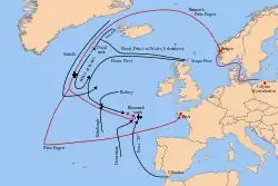 O Prinz Eugen foi reabastecido com 764 toneladas de óleo combustível enquanto estava em Bergen; por algum motivo desconhecido, o Bismarck não reabasteceu.[22] O Prinz Eugen, Bismarck e os três contratorpedeiros de escolta partiram às 19h30min de 21 de maio.[23] A força chegou em mar aberto aproximadamente à meia-noite e seguiu rumo ao oceano Ártico. Foi nesse momento que Raeder informou Hitler sobre a operação, que relutantemente permitiu que ela continuasse como planejado. Os três contratorpedeiros foram destacados às 4h14min do dia 22, enquanto a força passava perto de Trondheim. Lütjens ordenou por volta do meio-dia que seus dois navios seguissem em direção ao Estreito da Dinamarca numa tentativa de entrar nas águas abertas do Atlântico.[24]