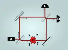 Diagrama do problema do teste de bomba. A - emissor de fótons, B - bomba a ser testada, C, D - detector de fótons. Os espelhos do canto inferior esquerdo e do canto superior direito são semi-prateados.