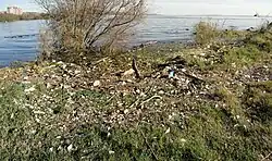A poluição hídrica consiste em modificações de origem humana nas propriedades físicas e químicas da água capazes de provocar dano aos seres humanos e ou à vida selvagem, incluindo-se aqui tanto rios e lagos como os mananciais subterrâneos e o mar. Suas causas principais derivam do lixo e esgotos urbanos e de substâncias usadas na agricultura e indústria, que são lançados diretamente nas águas ou lá acabam parando levados pelas chuvas ou por infiltrações.[32] Acidentes com despejos de substâncias nocivas em geral têm um impacto limitado, mas às vezes desencadeiam efeitos de grandes proporções com reflexos em vários ambientes associados. É um exemplo o derramamento de lama tóxica ocorrido em 2015 no rio Doce pelo rompimento de uma barragem da mineradora Samarco, que provocou pelo menos 17 mortes e prejudicou severamente a biologia de todo o rio abaixo do ponto do acidente, além de destruir uma vila, gerar grandes prejuízos econômicos e sociais e contaminar uma grande área de oceano e praias além da sua foz, sendo considerado o maior desastre ambiental da história do país.[33][34] Também são consideradas formas de poluição a contaminação salina e a mineralização dos mananciais.[35] O crescimento acelerado da população humana, com o aumento na demanda de água para consumo e outras atividades, reduz os estoques disponíveis, aumentando o problema porque menores quantidades de líquido são menos capazes de diluir os contaminantes.[32][36][37]