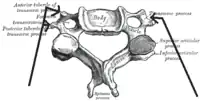 ![]() Uma vértebra torácica. (Processo transverso assinalado no centro.) | |