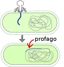 Um profago é um bacteriófago (muitas vezes abreviado para "fago") cujo genoma foi inserido integrado em um cromossomo circular bacteriano ou existe como um plasmídeo extracromossomal. Esta é uma forma latente de fago, em que os genes virais estão presentes em bactérias sem causar seu rompimento. "Pro" significa "antes", portanto, profago significa o estágio de um bacteriófago antes de ser ativado dentro do hospedeiro.