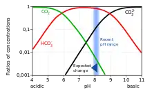 Relação entre as proporções das principais espécies químicas do sistema carbonato de acordo com o pH da solução. A área azul representa a faixa de variação de pH na água do mar e a seta indica a mudança esperada com a acidificação oceânica.