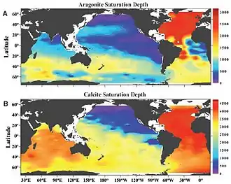 Existem duas formas minerais de carbonato de cálcio: aragonita e calcita. Na água do mar, a aragonita é mais solúvel que a calcita.[1] Consequentemente, a profundidade de saturação da aragonita no oceano global é menor do que a profundidade de saturação da calcita. Os fatores que mais influenciam a solubilidade do carbonato de cálcio na água do mar são temperatura, pressão e pH.[1][2] Temperaturas mais baixas aumentam a solubilidade tanto da aragonita quanto da calcita, assim como pressões mais elevadas. Massas de água ricas em dióxido de carbono apresentam pH com caráter mais ácido, facilitando a solubilidade do carbonato de cálcio. Por isso, massas de água frias, profundas e antigas apresentam maior solubilidade de aragonita e calcita.[1]