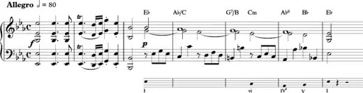 A abertura do Concerto para Piano nº 22 (em E# M, K. 482) estende a progressão de modo sutil, fazendo uso de suspensões:[42]