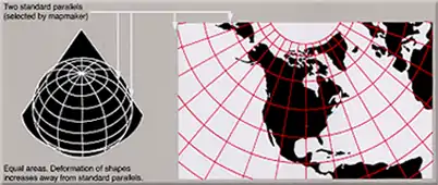 A projeção de Albers é uma projeção cônica equivalente [1][2][3] com dois paralelos padrões, também chamada de projeção cônica equivalente de Albers.[1][2]