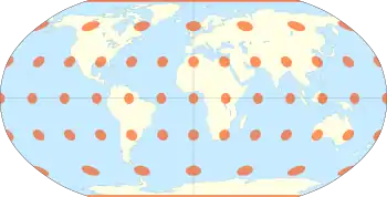 Assim, a distorção perto dos polos é severa, mas declina rapidamente para níveis moderados afastando-se deles. Os paralelos retos implicam distorção angular severa nas altas latitudes em direção às bordas externas do mapa — uma falha inerente a qualquer projeção pseudocilíndrica. No entanto, na época em que foi desenvolvida, a projeção atendeu efetivamente ao objetivo de Rand McNally de produzir representações atraentes do mundo inteiro.[5][6]