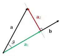 O vetor componente de a perpendicular a b, por vezes também chamado de componente ortogonal de a em relação a b,[1] é a projeção ortogonal de a sobre o plano (ou, em geral, hiperplano) ortogonal a b. Tanto a projeção a1 quanto a componente ortogonal a2 de um vetor a são vetores, e a sua soma é igual a a, o que implica que a componente ortogonal é dada por
