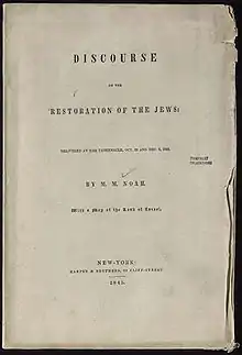 Em 1820, como precursor do sionismo moderno, Mordecai Manuel Noah tentou fundar uma pátria judaica na ilha de Grand Island, situada no Rio Niágara, a ser chamada "Ararat," fazendo referência ao Monte Ararate, o local de repouso bíblico da arca de Noé. Ele erigiu um monumento na ilha que dizia "Ararat, uma cidade de refúgio para os judeus, fundada por Mordecai M. Noah no mês de Tishri, 5586 (Setembro de 1825) e no quinquagésimo ano da independência americana." Alguns especulam se suas ideias utópicas poderiam ter influenciado Joseph Smith, que fundou o movimento dos Santos dos Últimos Dias no estado de Nova Iorque alguns anos depois. No seu Discurso sobre a restauração dos judeus, Noah proclamou sua fé de que os judeus retornariam e reconstruiriam sua antiga pátria e pedia aos Estados Unidos que liderassem essa empreitada.[4]
