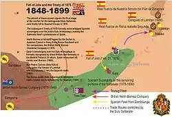 Em 1885, Reino Unido, Alemanha e Espanha assinaram o Protocolo de Madrid para reforçar a influência espanhola nas Filipinas, definindo o limite da área de influência espanhola na região e reconhecendo a soberania espanhola sobre o arquipélago de Sulu. No mesmo acordo, a Espanha renunciou a seus direitos sobre o Bornéu do Norte.[4]