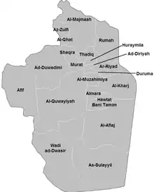 Na Arábia Saudita as províncias (em árabe: محافظات; romaniz.:muhafazat; sing. muhafazah) são o segundo nível de administração regional. Cada um dos 13 emirados da Arábia Saudita está subdividido em províncias, que por sua vez são subdivididas em distritos (marcazes), apesar de alguns distritos se reportarem diretamente ao emirado da capital, em vez de uma das províncias. As próprias capitais de emirados não estão incluídas dentro de nenhuma província, mas são em vez disso governadas "por município" (amana), com cada município que é encabeçado por um prefeito (amim). As províncias, na Arábia Saudita, podem ser "Categoria A " ou "Categoria B", dependendo do tamanho demográfico.[1]