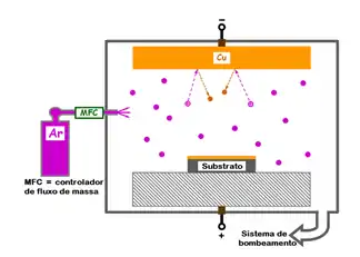 No processo de sputtering os átomos são removidos da superfície de um material denominado alvo através de transferência de momento sustentável de uma partícula, através de bombardeamento energético de um íon gasoso acelerado a partir de um plasma, onde estão presentes elétrons, íons e espécies neutras. Para obter-se a deposição por sputtering, é necessário que a câmara de processos esteja em vácuo. [3][7]