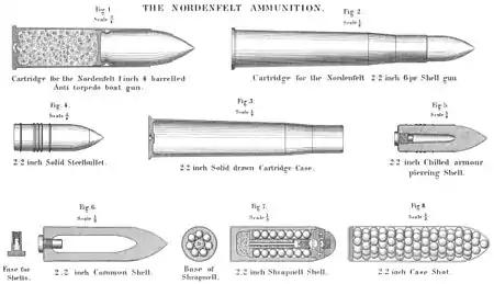 Diagramas mostrando os designs de munição proprietária Nordenfelt de 1 polegada (canto superior esquerdo) e de 6 libras (todos os outros, rotulados como "2,2 polegadas"):