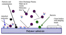 Gráfico mostrando absorção de moléculas, partículas e contaminação, plasma descarregado feito por: moléculas de atoms Ions, bactérias e superfície limpa com laços pendentes.
