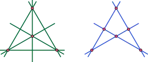 Um quadrângulo completo (a esquerda) e um quadrilátero completo (a direita).