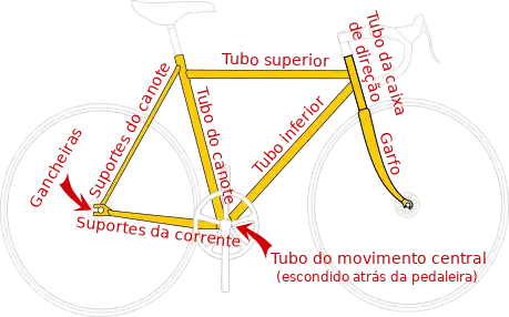 Os dois suportes da corrente, o tubo do canote e o tubo inferior encontram-se no tubo do movimento central. Este é um tubo horizontal perpendicular ao tubo do canote. No diagrama ao lado, ele está sendo ocultado pelo esboço branco de uma pedaleira (pedivela + coroa).