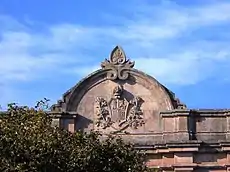 A parte central da fachada, que determina o carácter institucional do edifício e onde se encontra a porta de entrada, a base, os parapeitos da varanda, os lintéis das janelas e portas, as pilastras e as cornijas são feitos de granito e o resto da parede de alvenaria. A fachada é coroada no topo por um frontão circular encimado por uma forma vegetal (que originalmente serviu de suporte à bandeira), sobre o qual se encontra o brasão de armas de Espanha, também em granito. A simetria total e a continuidade das múltiplas janelas ao longo das fachadas são notáveis, criando um interior luminoso.[30] Na fachada oriental e no grande pátio central, as molduras das janelas de pedra são simples e não decoradas.