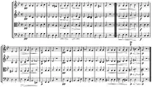 | Na segunda variação, o violoncelo leva o tema, com o primeiro violino fazendo o papel pulsante - desta vez em semicolcheias. | |