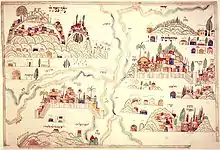 Mapa fora de escala do século XIX das quatro cidades sagradas do judaísmo, com Jerusalém ocupando o quadrante superior direito, Hebrom logo abaixo, o Rio Jordão correndo de cima para baixo, Safed no quadrante superior esquerdo, e Tiberíades por baixo. cada uma das quatro cidades inclui representações dos locais sagrados, assim como túmulos de rabis santificados e homens santos