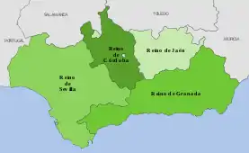 Por ordem da conquista, estes quatro reinos eram: Reino de Córdova (1236), o Reino de Xaém (1246), o Reino de Sevilha (1248) e o Reino de Granada (1492). Estes reinos ocupavam grande parte da extensão atual da comunidade autónoma espanhola da Andaluzia.[2] A denominação "Quatro Reinos da Andaluzia" foi usada meramente de forma geográfica, entre o momento das conquistas até ao séc. XIX, aquando da divisão territorial espanhola de 1833.[3]